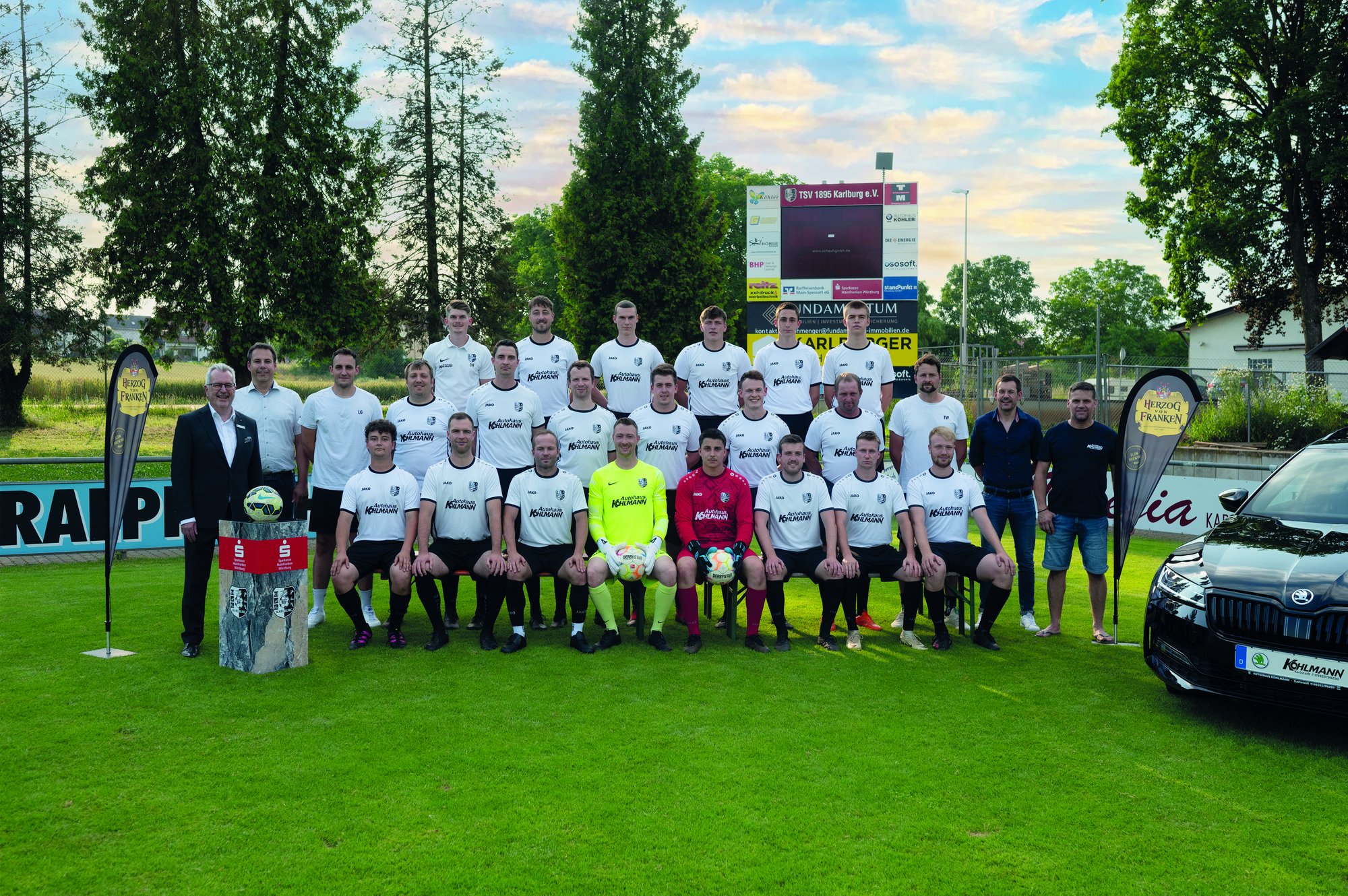 Mitte, von links: Peter Schmitt (Sparkasse Mainfranken Würzburg), Dr. Michael Rösch (1. Vorsitzender), Leonard Gopp (Trainer TSV III), Christian Rüppel (Trainer TSV III), Simon Wichmann, Max Köhler, Ben Kohlmann, Julian Martin, Michal Eiben, Tobias Wießmann (Trainer TSV II), Manuel Steigerwald (Vorstand Fußball), Andreas Kohlmann (Autohaus Kohlmann)